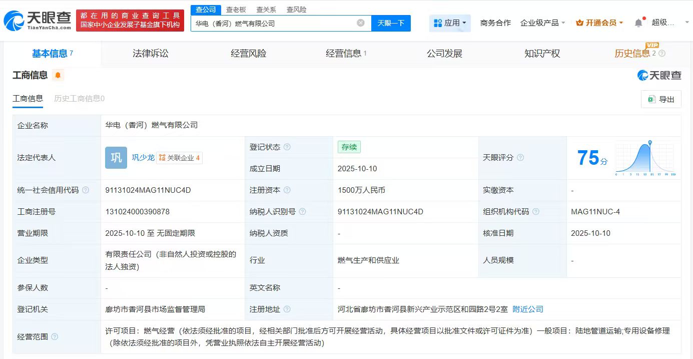 天眼查App显示,近日,华电(香河)燃气有限公司成立,法定代表人为巩少龙,注册资本1500万人民币,经营范围包括燃气经营、陆地管道运输、专用设备修理,由华电集团旗下华电香河能源有限公司全资持股。