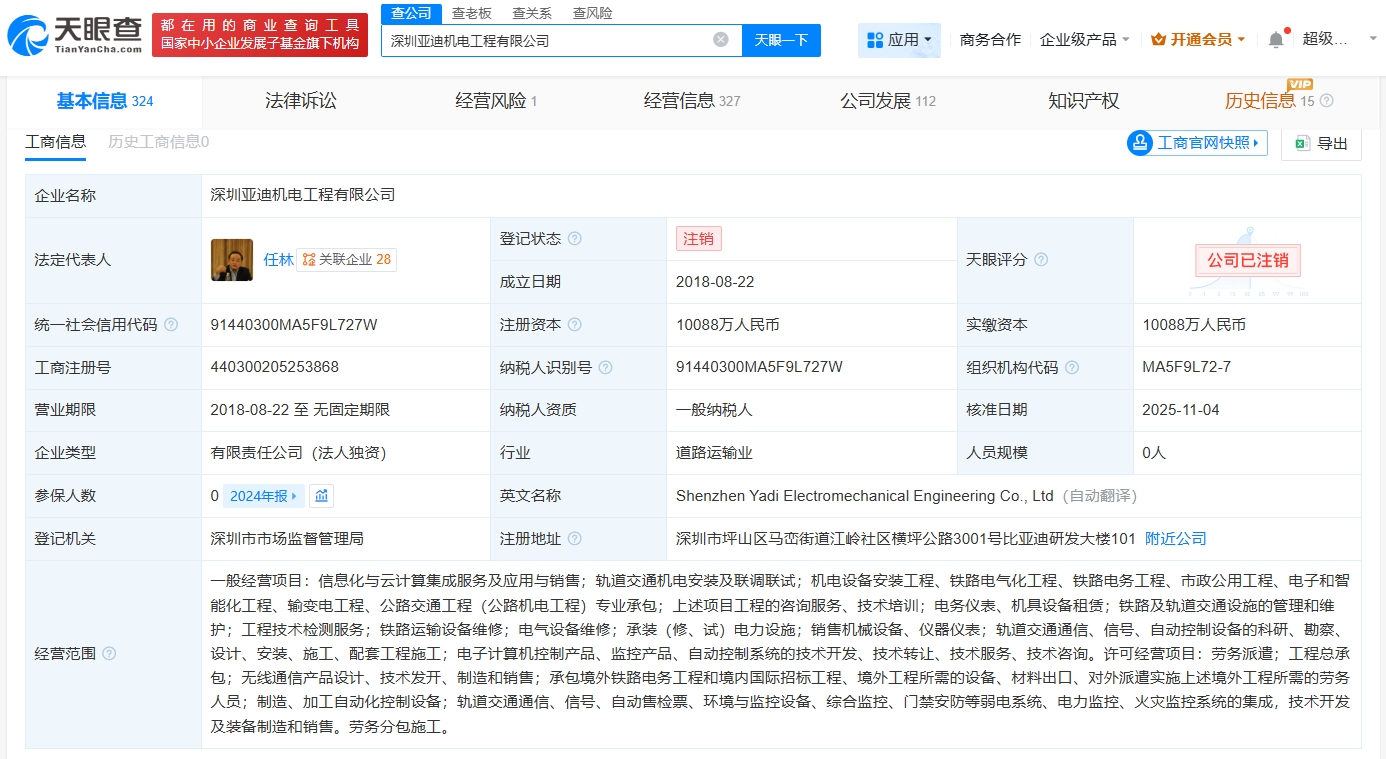 天眼查工商信息显示,近日,深圳亚迪机电工程有限公司登记状态由存续变更为注销。此前,该公司已发布注销备案公告。