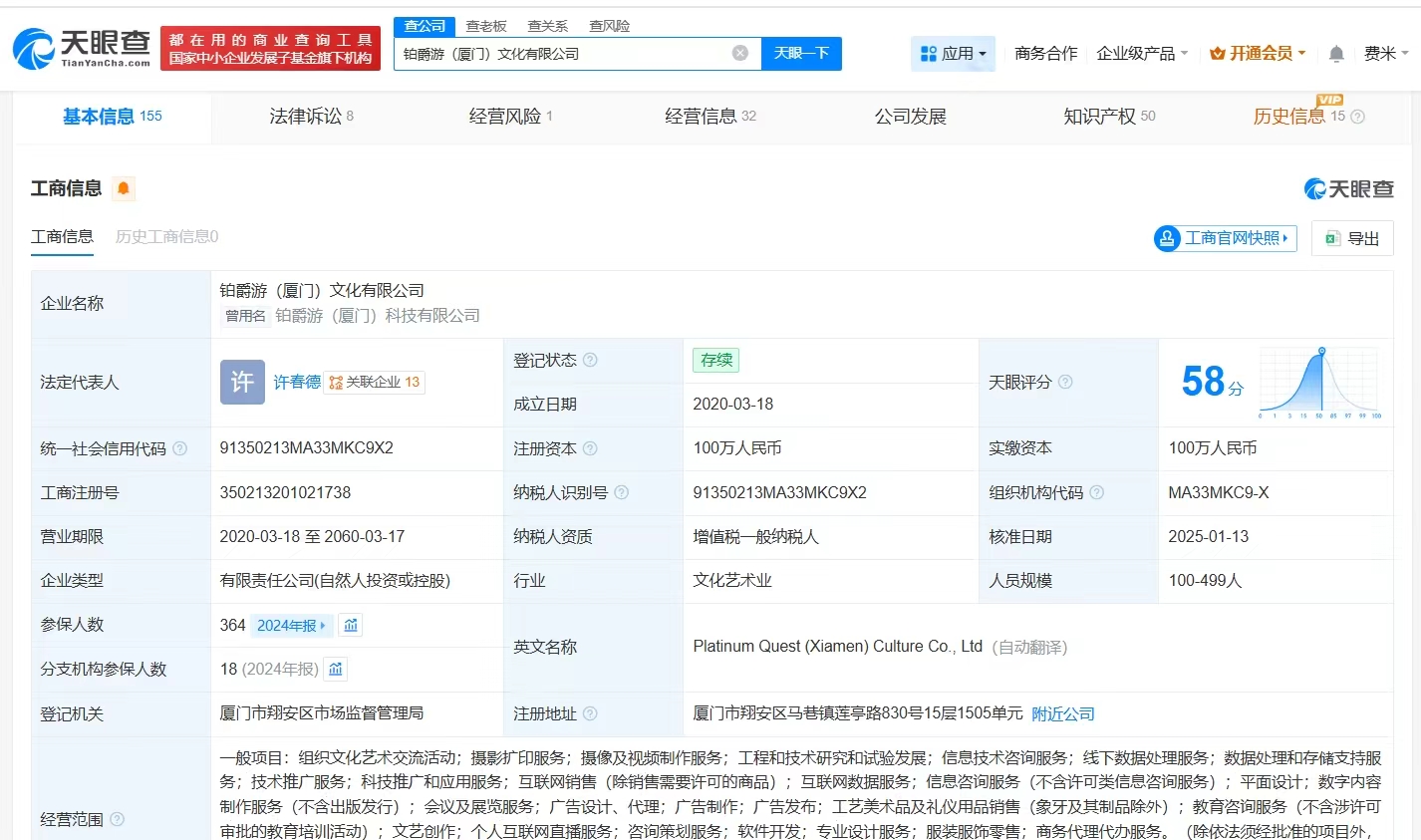 铂爵游(厦门)文化有限公司成立于2020年3月,法定代表人为许春德,注册资本100万人民币,经营范围包括组织文化艺术交流活动、摄影扩印服务、摄像及视频制作服务等。股东信息显示,该公司由铂爵旅拍文化集团有限公司、厦门公爵游投资合伙企业(有限合伙)共同持股。