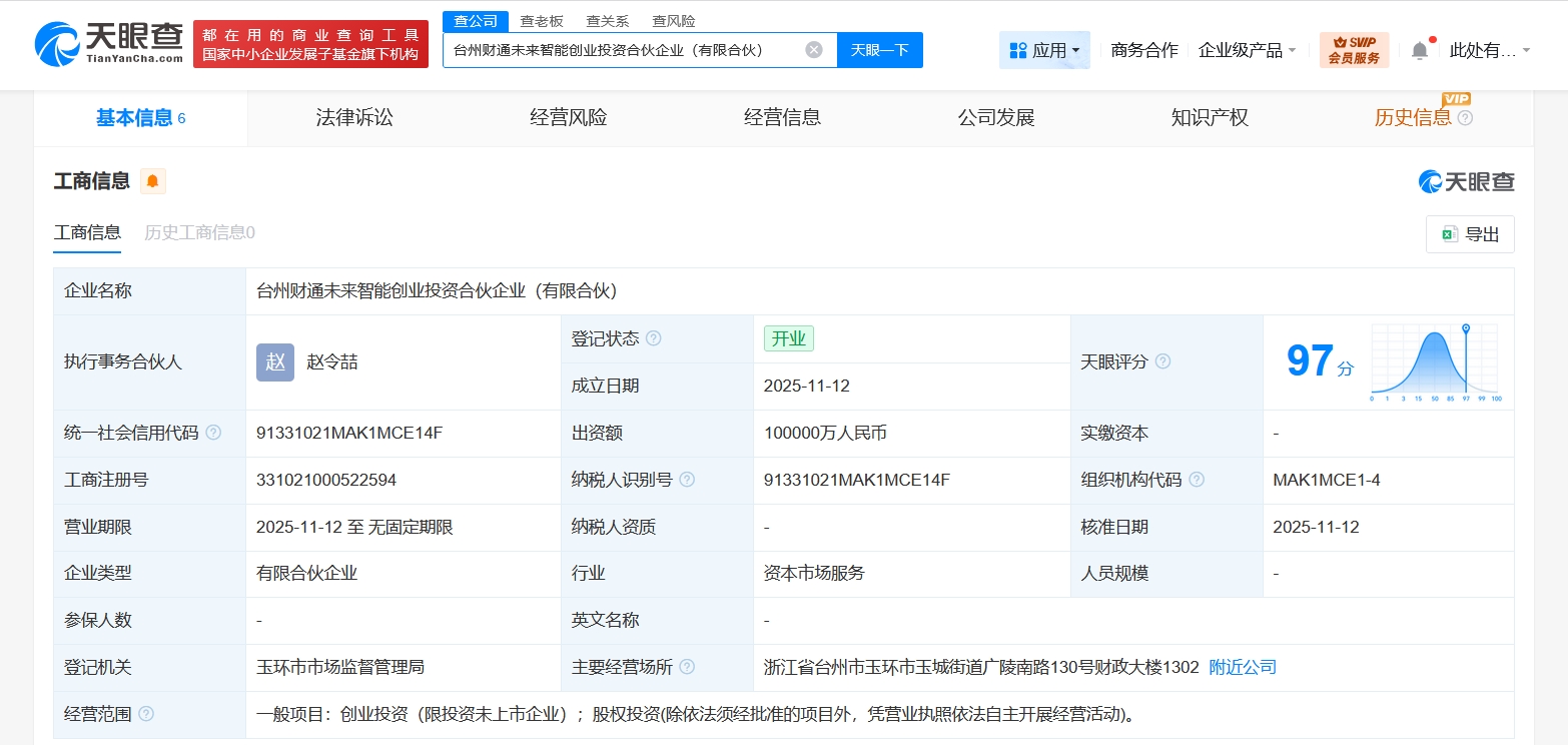 天眼查工商信息显示,近日,台州财通未来智能创业投资合伙企业(有限合伙)成立,执行事务合伙人为赵令喆,出资额10亿人民币,经营范围为创业投资、股权投资。合伙人信息显示,该合伙企业由玉环市国有资产投资经营集团有限公司、浙江财通资本投资有限公司、台州金投科创母基金股权投资合伙企业(有限合伙)、台州市开投资本运营有限公司、天台县交通投资集团有限公司共同出资。
