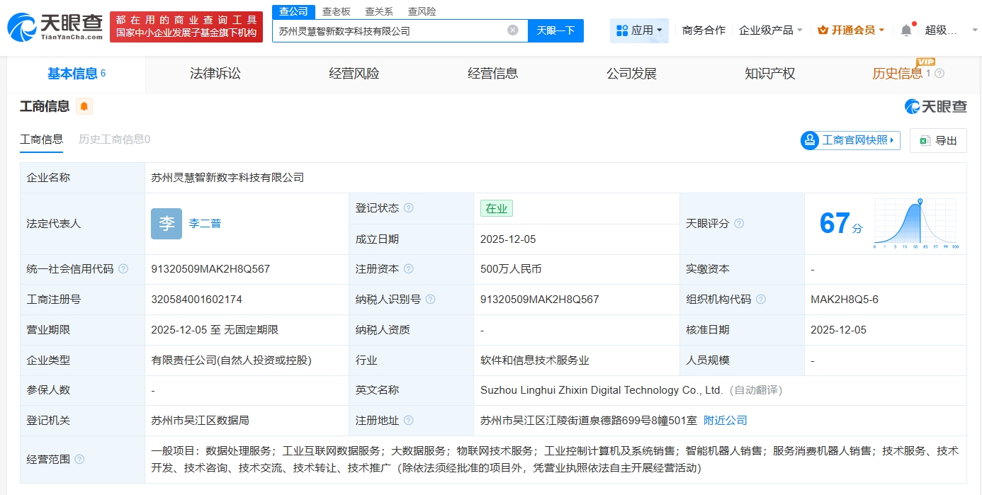 天眼查App显示,近日,苏州灵慧智新数字科技有限公司成立,法定代表人为李二普,注册资本500万人民币,经营范围包括工业互联网数据服务、大数据服务、物联网技术服务、工业控制计算机及系统销售、智能机器人销售等。股东信息显示,该公司由苏州灵猴机器人有限公司、吴江东运创业投资有限公司、智元创新(上海)科技股份有限公司共同持股。
