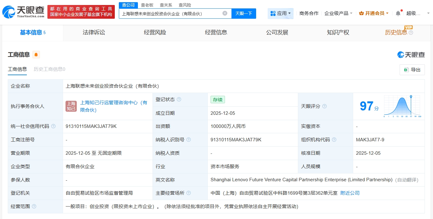 天眼查工商信息显示,近日,上海联想未来创业投资合伙企业(有限合伙)成立,执行事务合伙人为上海知己行远管理咨询中心(有限合伙),出资额10亿人民币,经营范围为创业投资。合伙人信息显示,该合伙企业由联想旗下纳远明志(海南)创业投资有限公司、上海未来启点私募投资基金合伙企业(有限合伙)、上海浦东引领区投资中心(有限合伙)等共同出资。
