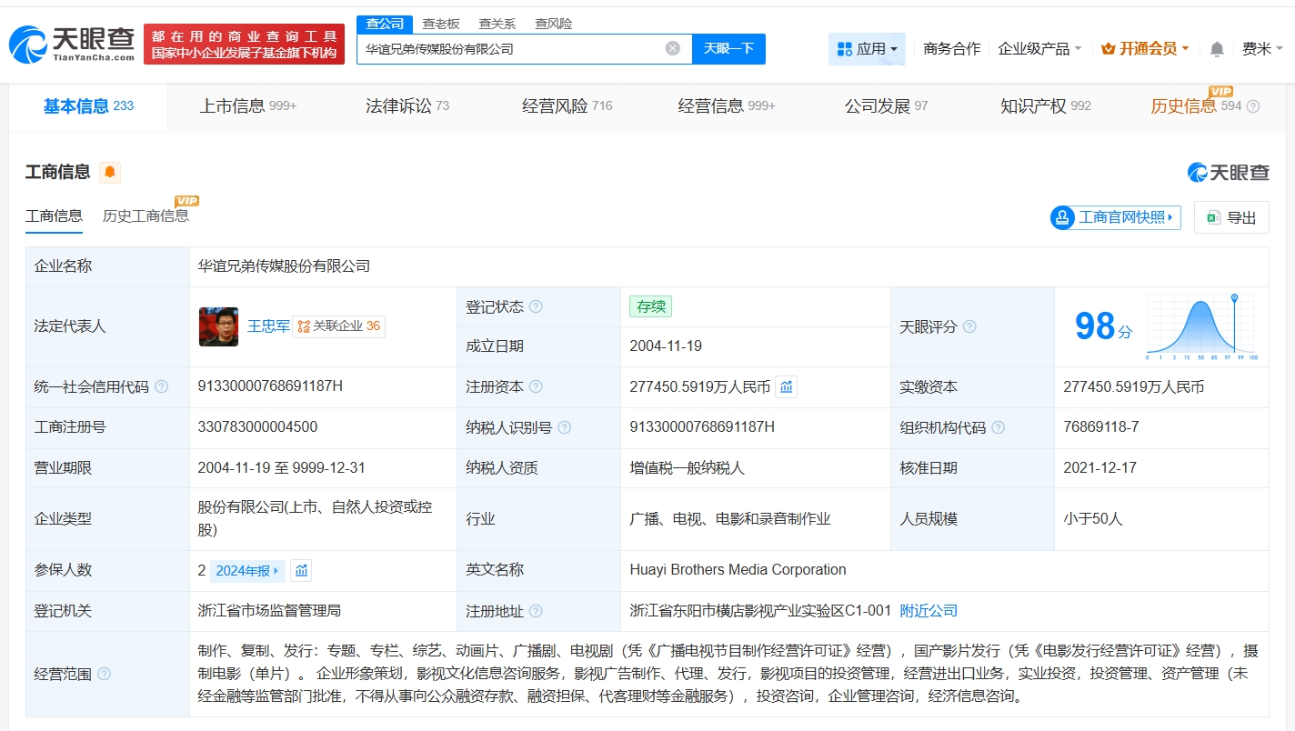 华谊兄弟传媒股份有限公司成立于2004年11月,法定代表人为王忠军,注册资本约27.7亿人民币,经营范围包括企业形象策划、影视文化信息咨询服务、影视项目的投资管理等,由王忠军、杭州阿里创业投资有限公司、马云等共同持股。
