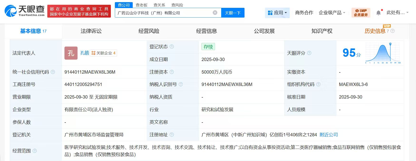 天眼查工商信息显示,近日,广药云山分子科技(广州)有限公司成立,法定代表人为孔箭,注册资本5亿人民币,经营范围为医学研究和试验发展,技术服务、技术开发、技术咨询、技术交流、技术转让、技术推广,以自有资金从事投资活动,第二类医疗器械销售,食品互联网销售,食品销售。股东信息显示,该公司由白云山(600332)全资持股。
