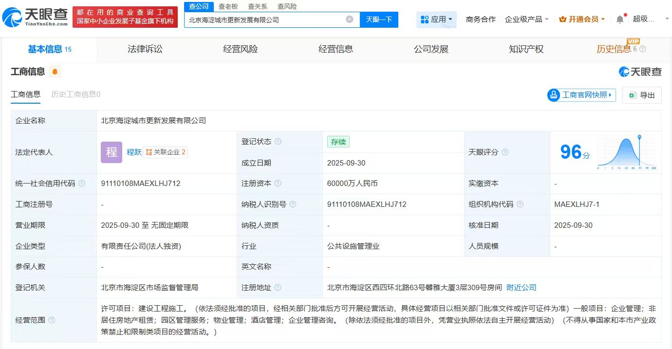 天眼查App显示,近日,北京海淀城市更新发展有限公司成立,法定代表人为程跃,注册资本6亿人民币,经营范围包括建设工程施工、企业管理、非居住房地产租赁、园区管理服务等,由北京市海淀区国有资产投资集团有限公司全资持股。
