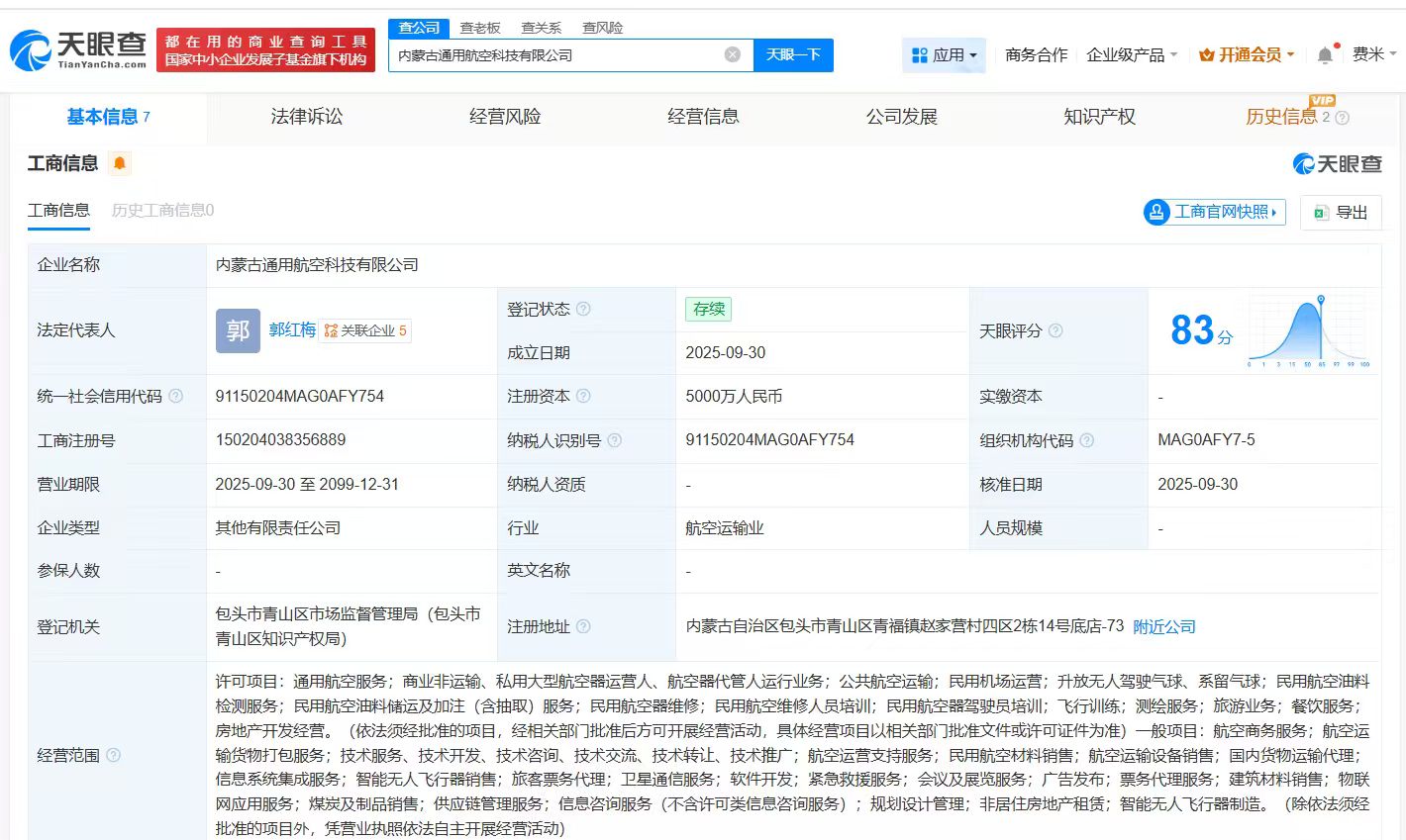 天眼查App显示,近日,内蒙古通用航空科技有限公司成立,法定代表人为郭红梅,注册资本5000万人民币,经营范围包括通用航空服务、公共航空运输、民用机场运营等,由西安通用航空机场建设有限公司、北京宏宇利昌投资咨询有限公司共同持股。