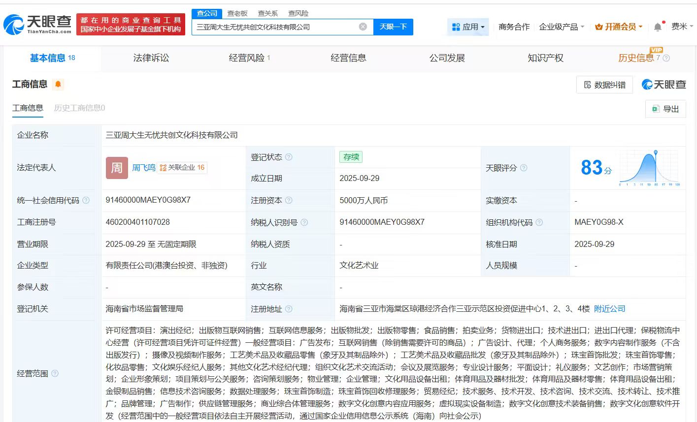 天眼查App显示,近日,三亚周大生无忧共创文化科技有限公司成立,法定代表人为周飞鸣,注册资本5000万人民币,经营范围包括演出经纪、出版物互联网销售、互联网信息服务等,由周大生(002867)、无忧传媒集团有限公司、海南金生无忧文化产业投资中心(有限合伙)、周飞鸣共同持股。