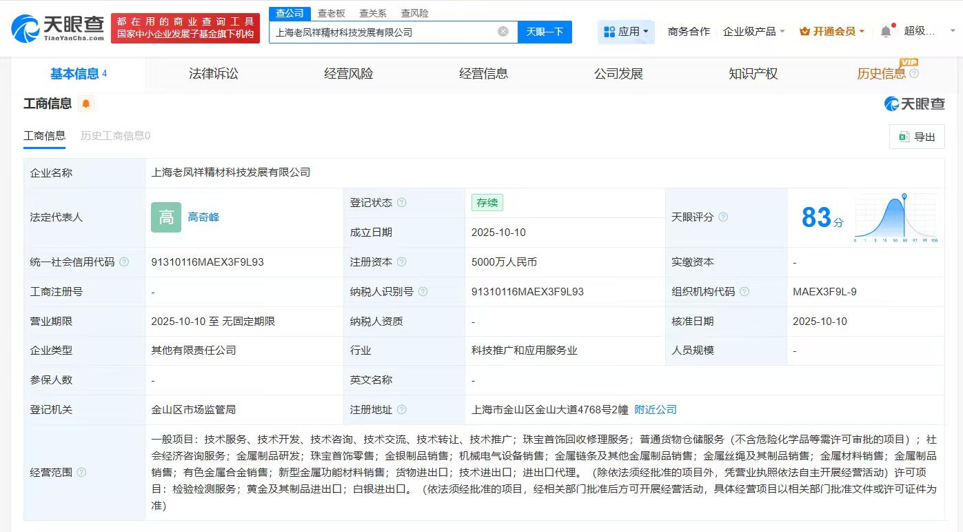 天眼查App显示,近日,上海老凤祥精材科技发展有限公司成立,法定代表人为高奇峰,注册资本5000万人民币,经营范围包括珠宝首饰回收修理服务、普通货物仓储服务、金属链条及其他金属制品销售等,由上海老凤祥首饰研究所有限公司、深圳市翠绿首饰股份有限公司、上海鑫派铂族贵金属有限公司共同持股。