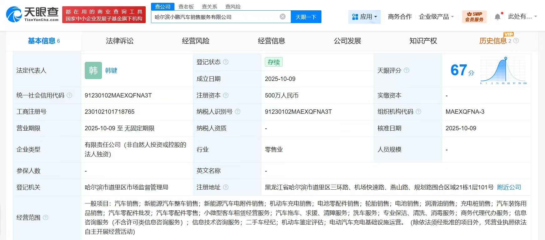 天眼查工商信息显示,近日,哈尔滨小鹏汽车销售服务有限公司成立,法定代表人为韩键,注册资本500万人民币,经营范围含汽车销售、新能源汽车整车销售、新能源汽车电附件销售、机动车充电销售、电池零配件销售、轮胎销售、电池销售、充电桩销售、信息技术咨询服务、二手车经纪等。股东信息显示,该公司由小鹏汽车销售有限公司全资持股。