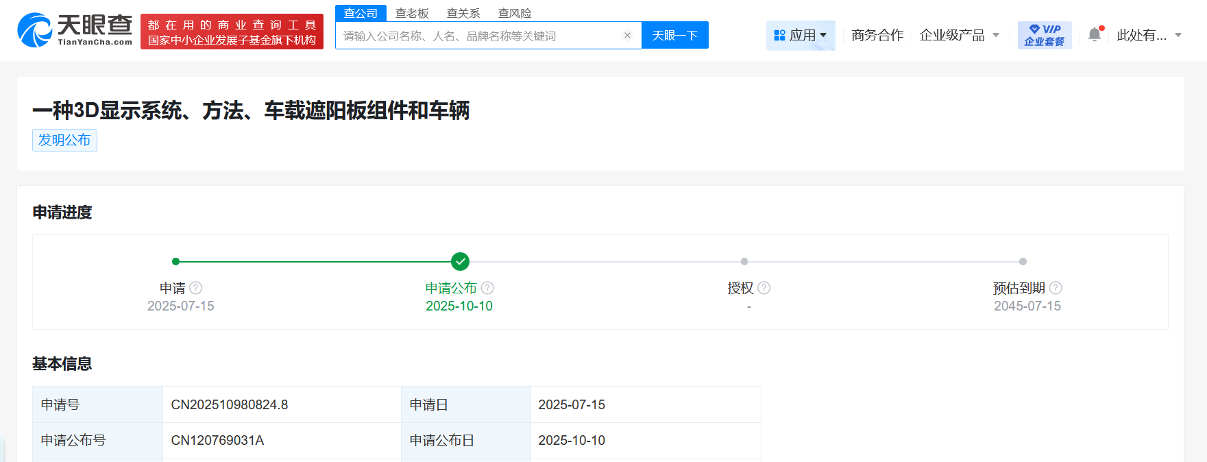 天眼查App显示,近日,比亚迪股份有限公司申请的“一种3D显示系统、方法、车载遮阳板组件和车辆”专利公布。