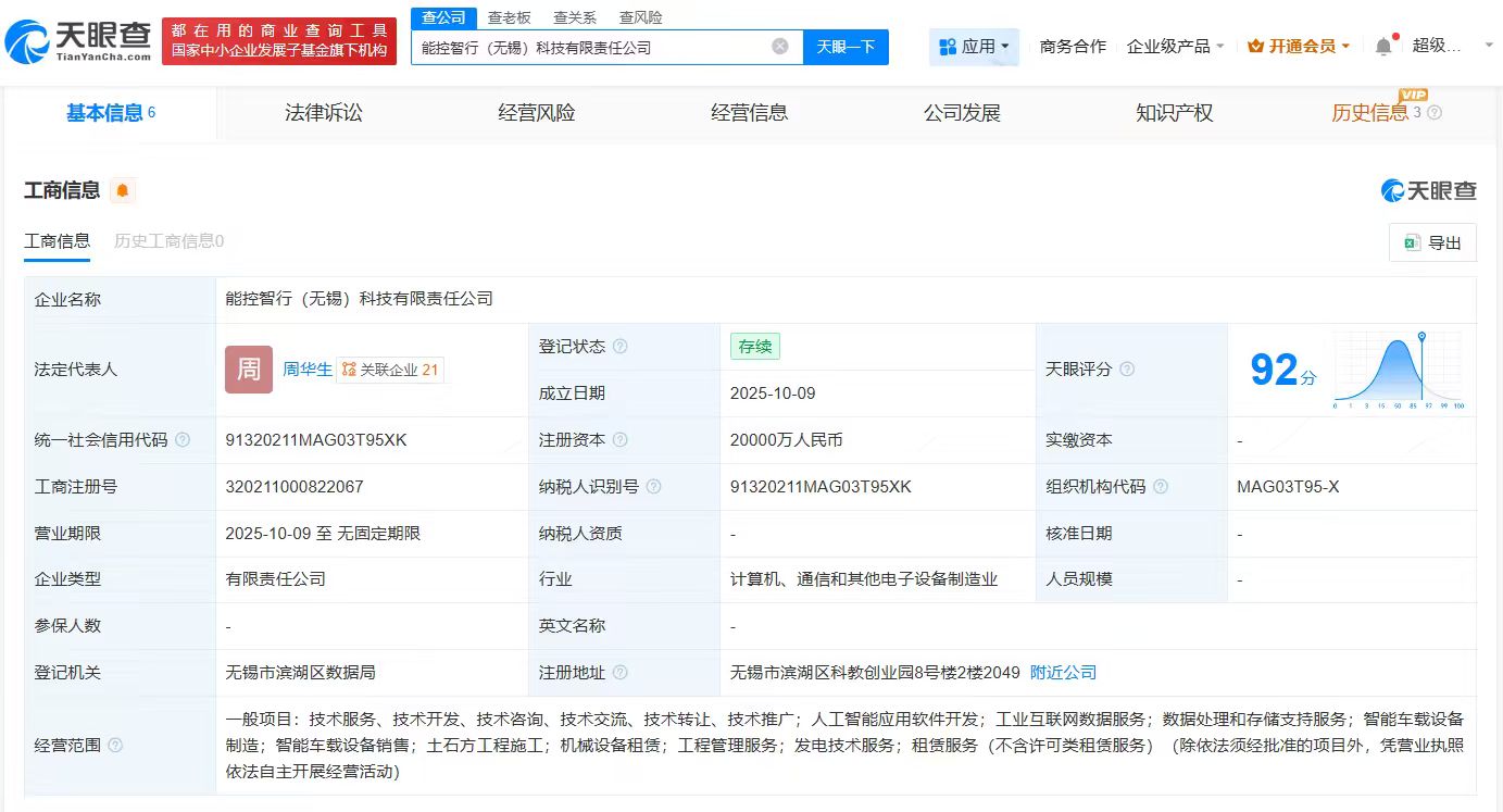 天眼查App显示,近日,能控智行(无锡)科技有限责任公司成立,法定代表人为周华生,注册资本2亿人民币,经营范围包括人工智能应用软件开发、工业互联网数据服务、数据处理和存储支持服务等,由踏歌智行科技有限公司、北京国能绿色低碳发展投资基金(有限合伙)共同持股。
