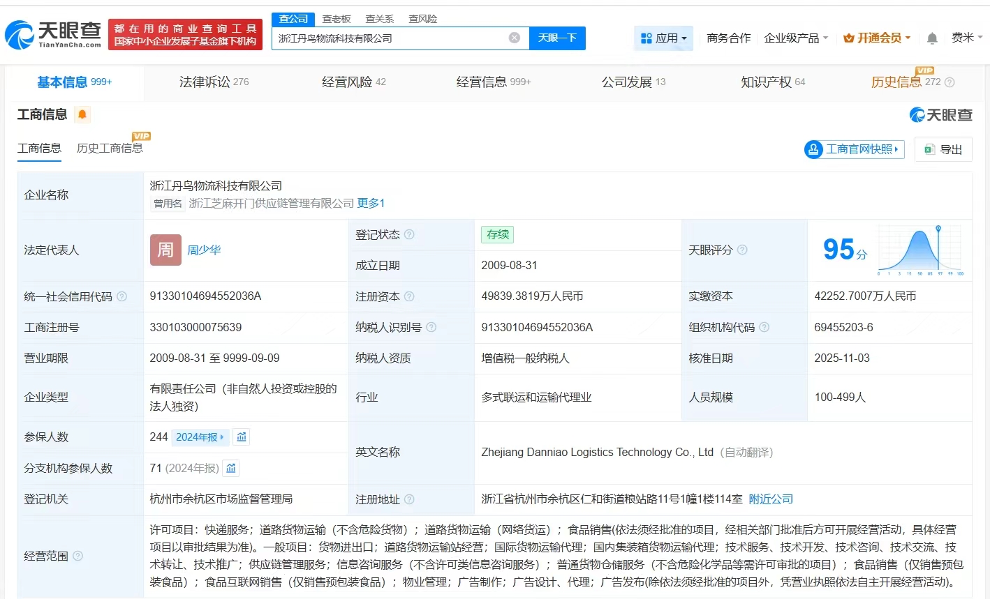 浙江丹鸟物流科技有限公司成立于2009年8月,注册资本约4.98亿人民币,经营范围包括快递服务、道路货物运输、食品销售等。