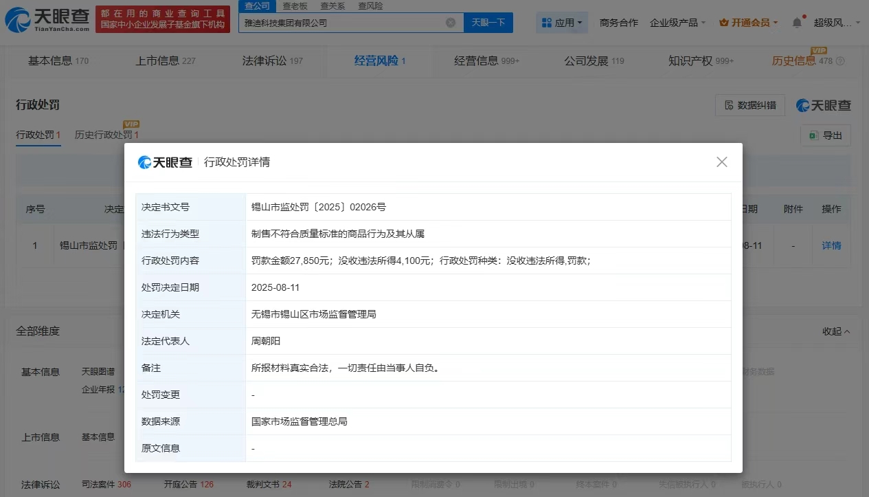 天眼查App显示,雅迪科技集团有限公司成立于2010年12月,法定代表人为周朝阳,注册资本1亿人民币,经营范围包括道路机动车辆生产、摩托车及零部件研发、助动车制造等,由无锡雅迪咨询有限公司全资持股。对外投资信息显示,该公司持有40余家股份,包括江苏雅迪科技发展有限公司、安徽雅迪新能源机车制造有限公司等。天眼风险信息显示,该公司涉及多起法律诉讼,案由包括产品责任纠纷等。此外,今年8月,该公司因制售不符合质量标准的商品,被无锡市锡山区市场监督管理局罚款2.78万余元,没收违法所得4100元。