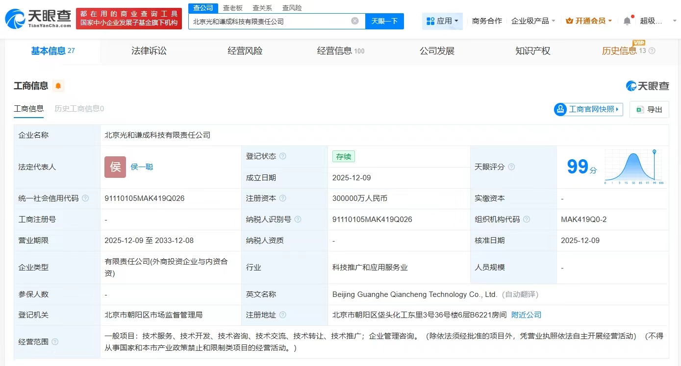 摘要: 近日,北京光和谦成科技有限责任公司成立。